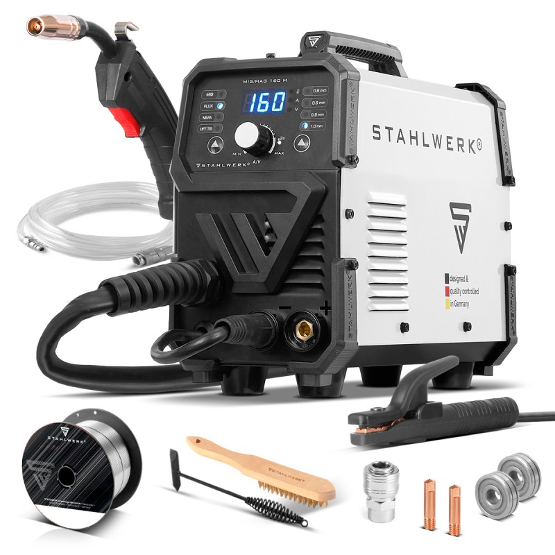 STAHLWERK MIG/MAG-160 M on kompaktne ja mitmekülgne inverter-keevitusseade kõigile, kes otsivad kerget, kuid täisfunktsionaalset traatkeevitusseadet lisafunktsioonidega. Kaaludes vaid 6,8 kg ja keevitusvoolu vahemikuga 20–160 A, hõlmab seade MIG/MAG gaasiga kaitsva keevituse, täidisega elektroodiga keevituse, MMA/elektroodkeevituse ja alalisvoolu tõste-TIG-keevituse protseduure – kõik see tavalisest 230 V pistikupesast. Kaasaegne IGBT-tehnoloogia tagab stabiilse kaare, kõrge efektiivsuse ja tugeva jõudluse igapäevaseks kasutamiseks. MIG/MAG ja täidisega režiimides töötleb MIG/MAG-160 M traate tavalistes läbimõõduga 0,6 / 0,8 / 1,0 mm ja 0,9 mm (täidisega traat). Kasutada saab standardseid 1 kg traadipooli. Poolihoidik mahutab 16 mm pooli. Traadi etteandekiirus kohandub automaatselt seatud keevitusvooluga, tagades ühtlase läbitungimise ja stabiilse kaare juhtimise. Gaasivaba täidisega elektroodiga keevituse puhul saab seadet hõlpsalt ümber pöörata. Lisaks traatkeevitusele teostab masin ka klassikalist MMA/elektroodkeevitust kaetud elektroodidega. Kuumkäivitus hõlbustab süütamist, samas kui kleepumisvastane funktsioon vähendab lühise korral voolu, hoides ära elektroodi ülekuumenemise ja võimaldades selle hõlpsamat eemaldamist töödeldavalt detaililt. Koos valikulise WP-17V Lift-TIG põletiga saab MIG/MAG-160 M kasutada ka DC TIG keevitusaparaadina kontaktsüütega – ideaalne peenemate ja puhtamate keevisõmbluste tegemiseks terasel ja roostevabal terasel. Juhtimine toimub kasutajasõbraliku esipaneeli kaudu, millel on digitaalne ekraan, keevitusprotsessi valik ja traadi läbimõõdu valik. Integreeritud ülekuumenemiskaitsesüsteem indikaator-LED-iga ja intelligentne nutikas jahutus võimsa ventilaatoriga kaitsevad elektroonikat ning võimaldavad praktilist töötsüklit kuni 60% 80 A juures ja 100% 62 A juures (ümbritseva õhu temperatuuril 40 °C). Tugev ST-Guard korpus muudab seadme vastupidavaks igapäevaseks töökojas kasutamiseks ja transportimiseks. MIG/MAG gaasikaitsega keevitamine (GMAW): MIG inertse gaasiga (nt argoon) ja MAG aktiivse gaasiga (nt CO₂ või segagaas) legeerimata ja madallegeeritud teraste jaoks; traat ja gaas antakse põletist koos, ideaalne produktiivseks ühe käega töötamiseks.