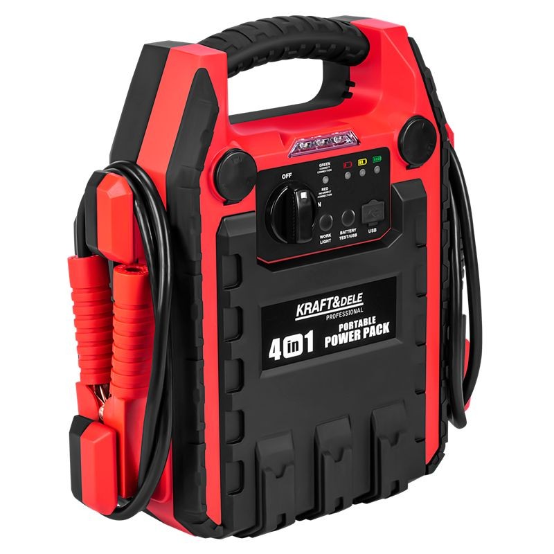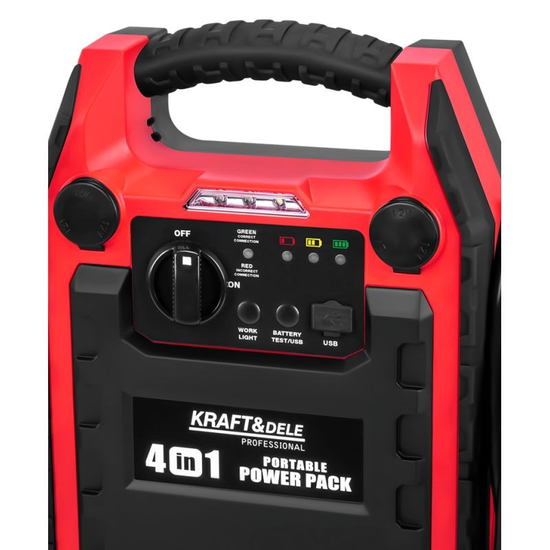 KD5346 оснащён мощным аккумулятором ёмкостью 22 А·ч, обеспечивающим высокий пусковой ток 1200 А, что позволяет запускать большинство транспортных средств с напряжением 12 В — от легковых автомобилей до мотоциклов и оборудования для отдыха. Встроенный компрессор с давлением 11 бар обеспечивает быстрое накачивание шин, а два 12-вольтовых прикуривателя и USB-порт позволяют подключать дополнительные устройства. Три ярких светодиода служат фонариком для мастерской, делая работу в тёмное время суток комфортной и безопасной. Все это дополняется прочной конструкцией с эргономичной ручкой и интуитивно понятной панелью управления, которая обеспечивает простоту использования даже на сложной местности. ОСОБЕННОСТИ ИЗДЕЛИЯ: