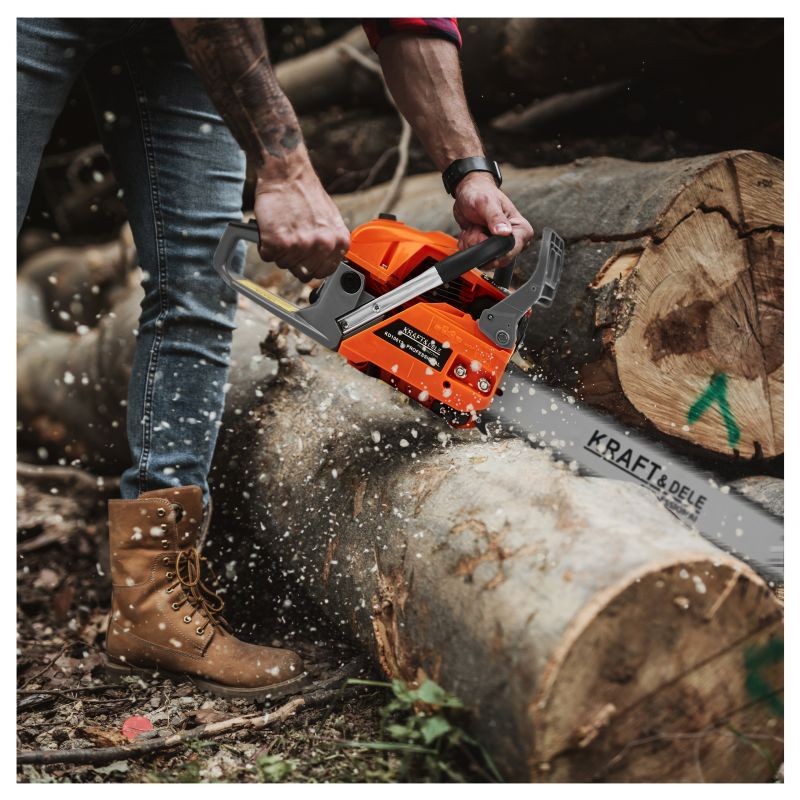 Профессиональная бензопила KRAFT&DELE мощностью 5,9 л.с. используется для работы по дереву как в лесном хозяйстве, так и в домашних условиях.