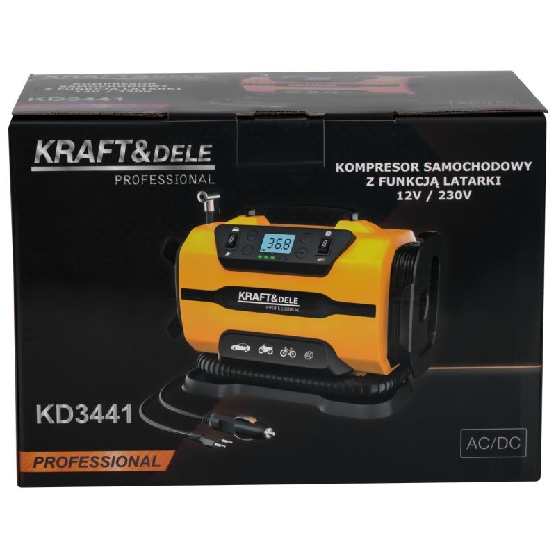 Автомобильный компрессор KD3441 — многофункциональное портативное устройство, идеально подходящее как для путешествий, так и для домашнего гаража. Благодаря двум источникам питания — 12 В постоянного тока (от прикуривателя) и 230 В переменного тока — он исключительно универсален и готов к использованию в любых условиях.
