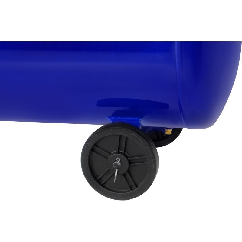 Установка оснащена двойным реле давления с манометрами для контроля давления на каждом рабочем выходе, сливным клапаном для отвода конденсата и большими транспортировочными колесами для удобного перемещения.