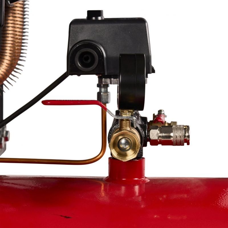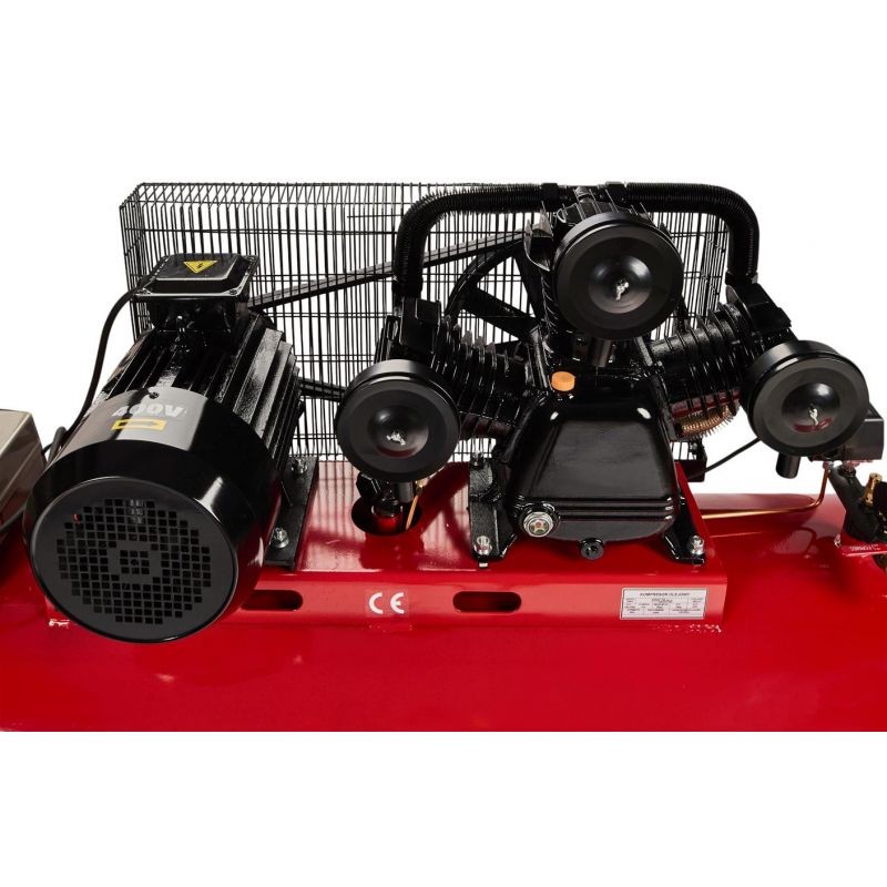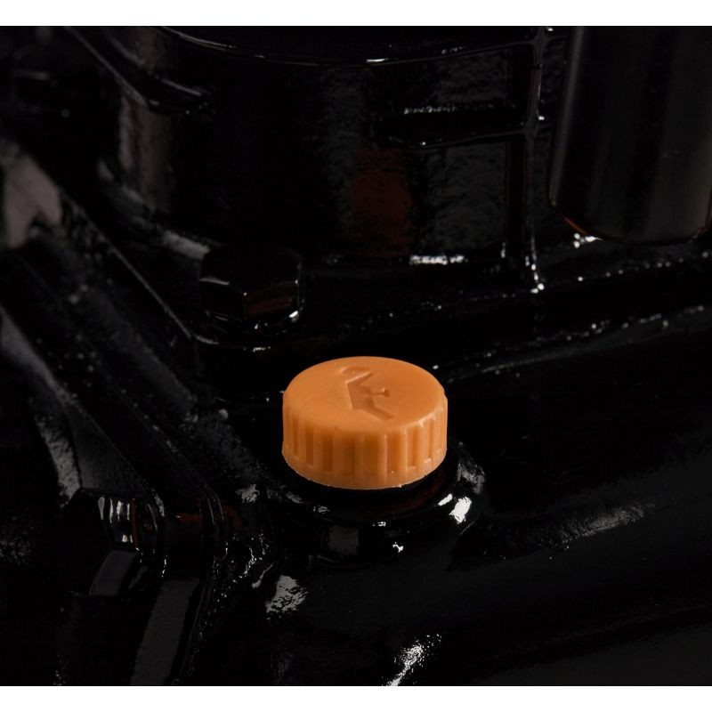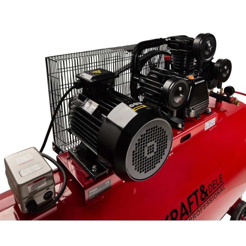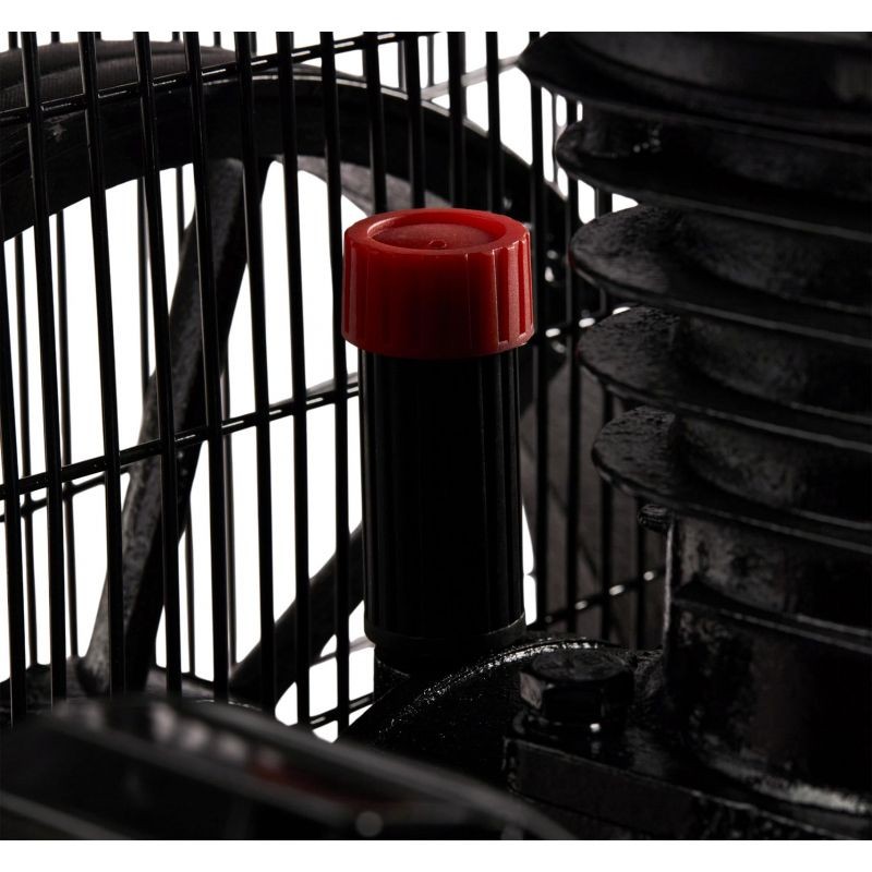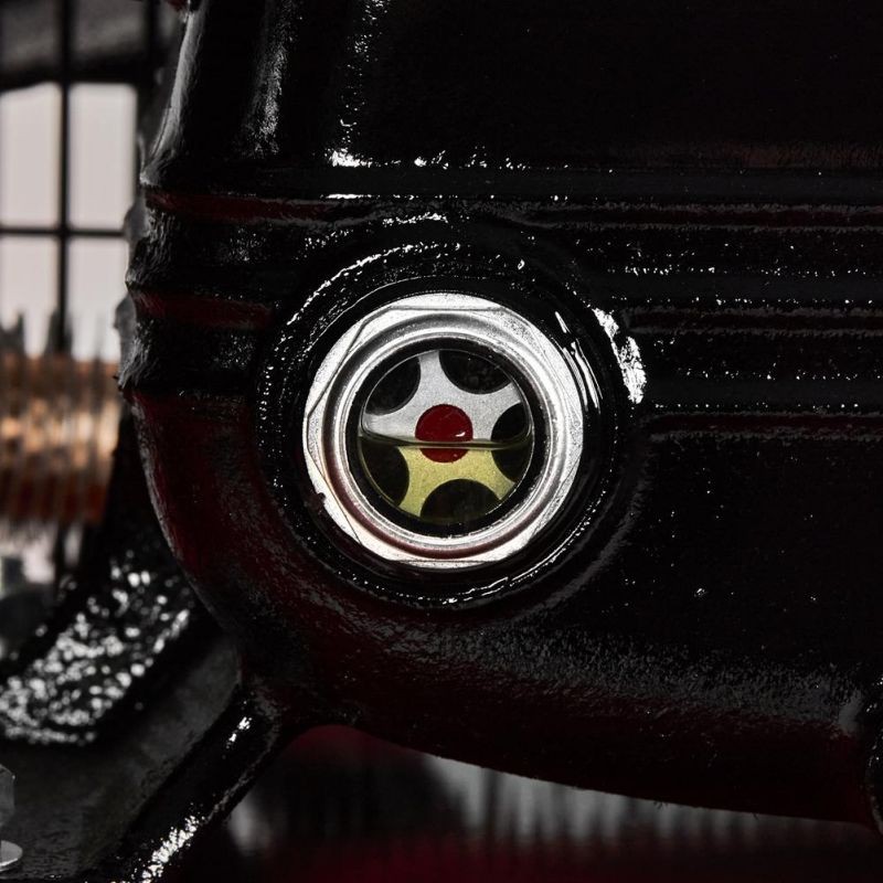 Компрессор оснащен тремя поршнями и чугунными цилиндрами, что обеспечивает высокую прочность, стабильную работу и эффективное охлаждение. Маслоотделитель с редуктором эффективно удерживает воду и масло из отработанного воздуха, улучшая работу подключенных пневматических инструментов. Реле давления защищает двигатель от перегрузки и перегрева.