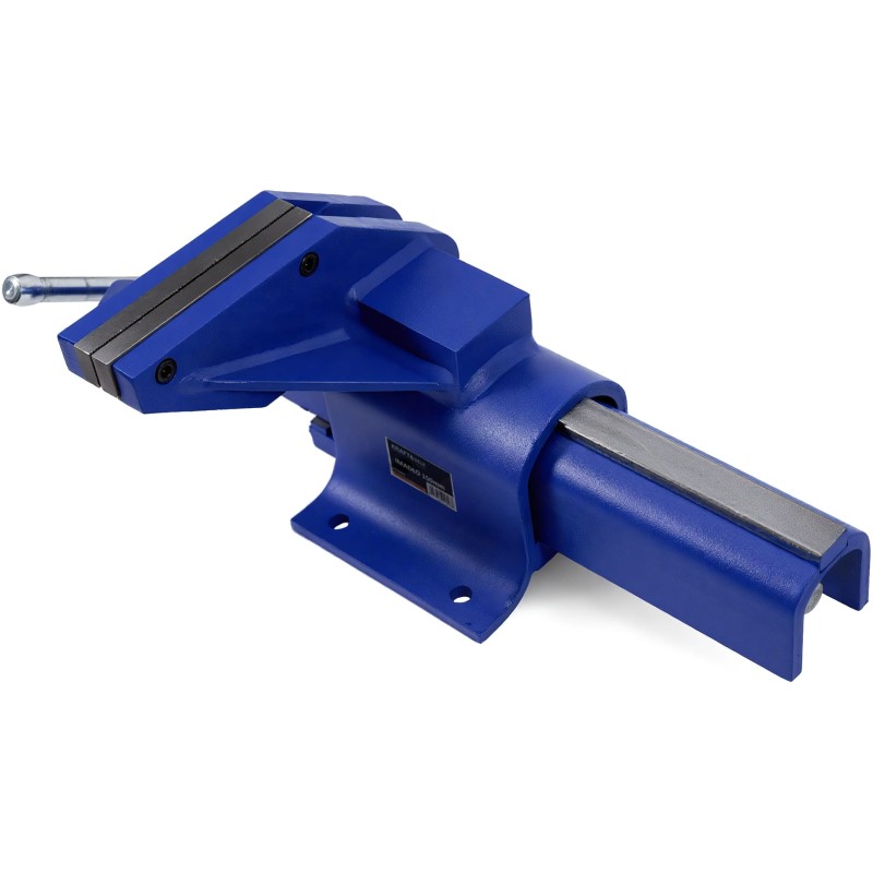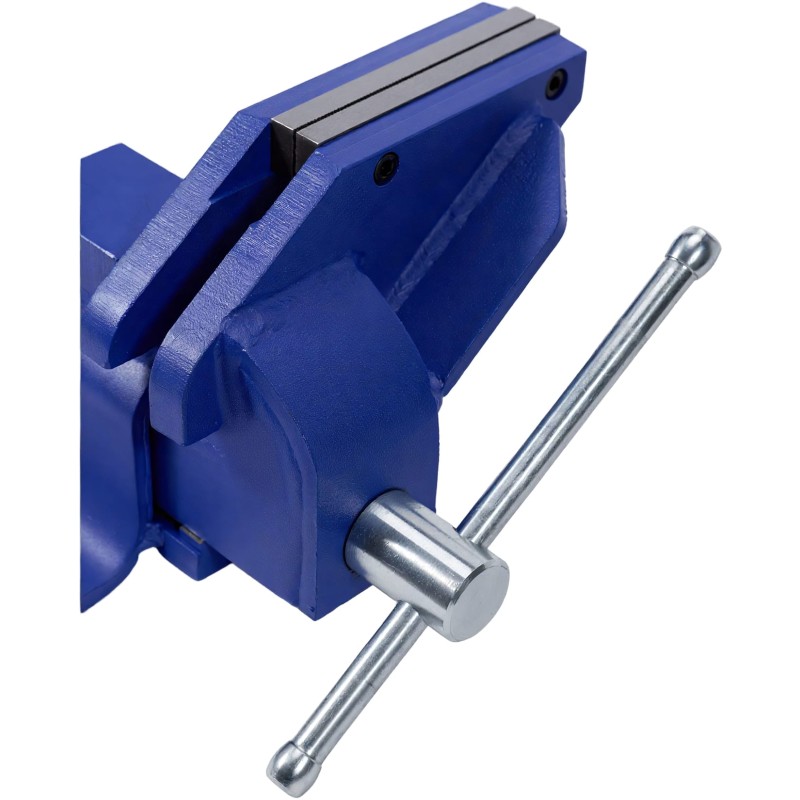 Корпус тисков изготовлен из ударопрочного чугуна и покрыт порошковой краской с эффектом ковки для защиты от коррозии. Эта модель оснащена сменными губками шириной 150 мм из высококачественной стали. Ходовой винт обеспечивает плавное и удобное открывание и закрывание губок, гарантируя точную регулировку давления и надежное зажимание заготовки.