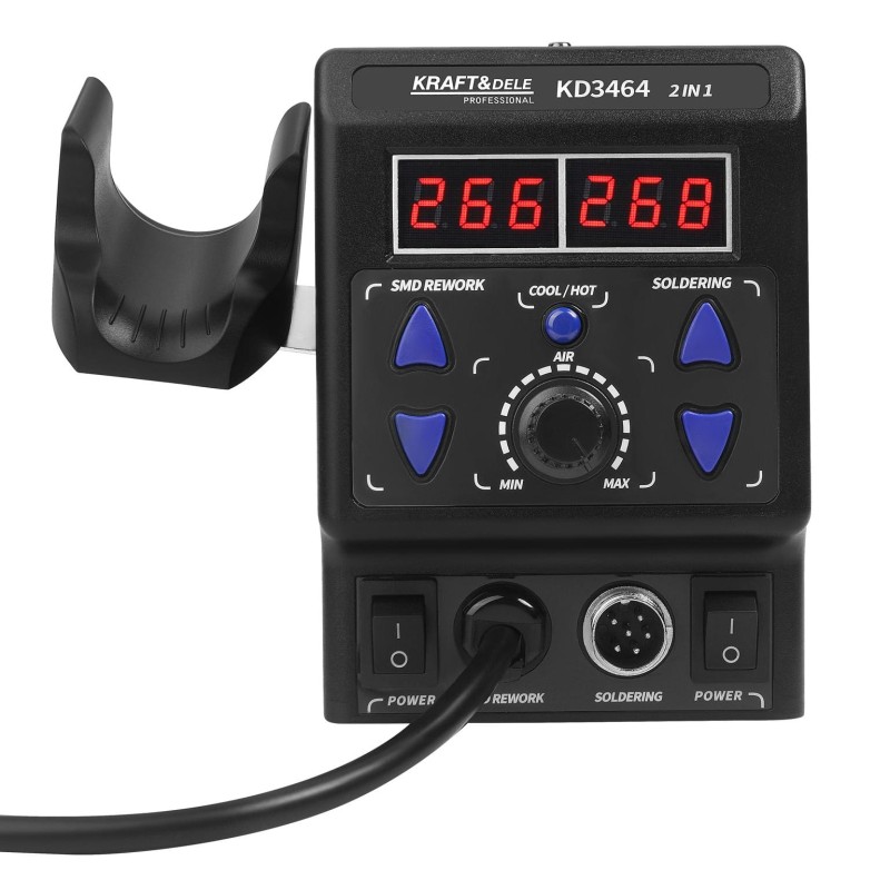 Бесщёточный вентилятор обеспечивает мягкий и равномерный поток воздуха, а автоматическое отключение защищает аппарат и повышает безопасность работы. KD3464 также поставляется с многочисленными аксессуарами, облегчающими пайку и сварку: сменными насадками, насадками для фена, флюсом, шприцом, отсасывающей насадкой и паяльным ковриком, что делает станцию полноценным инструментом для мастерской.