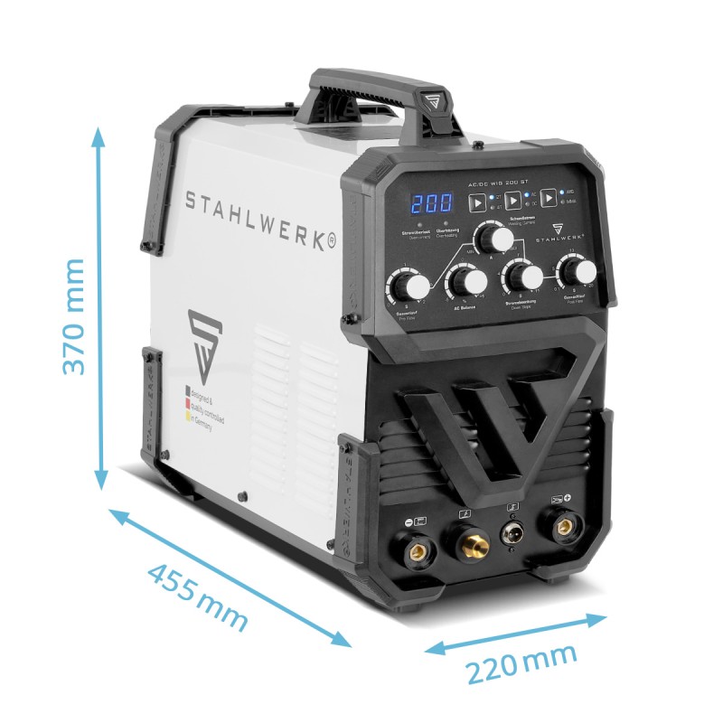 Сварочный аппарат STAHLWERK AC/DC WIG 200 ST — это мощный TIG-аппарат с возможностью сварки MMA и ручной дуговой сварки. Одним из преимуществ этого комбинированного сварочного аппарата 2-в-1, работающего от сети переменного тока, является его компактная конструкция и малый вес — всего 12,7 кг. AC/DC WIG 200 ST обладает такими практическими функциями, как интеллектуальное охлаждение и встроенная защита от перегрева. Во время TIG-сварки бесконтактное высокочастотное зажигание обеспечивает комфортную работу и улучшенные результаты сварки. Предварительный и последующий потоки сварочного газа регулируются индивидуально для защиты вольфрамового электрода от износа и предотвращения окисления сварного шва. Современная технология IGBT обеспечивает максимальную производительность как при TIG, так и при MMA сварке. В режиме переменного тока возможна сварка алюминия переменным током, поскольку оксидный слой надежно разрушается. Сварочный аппарат AC/DC WIG 200 ST поставляется с полным комплектом принадлежностей.