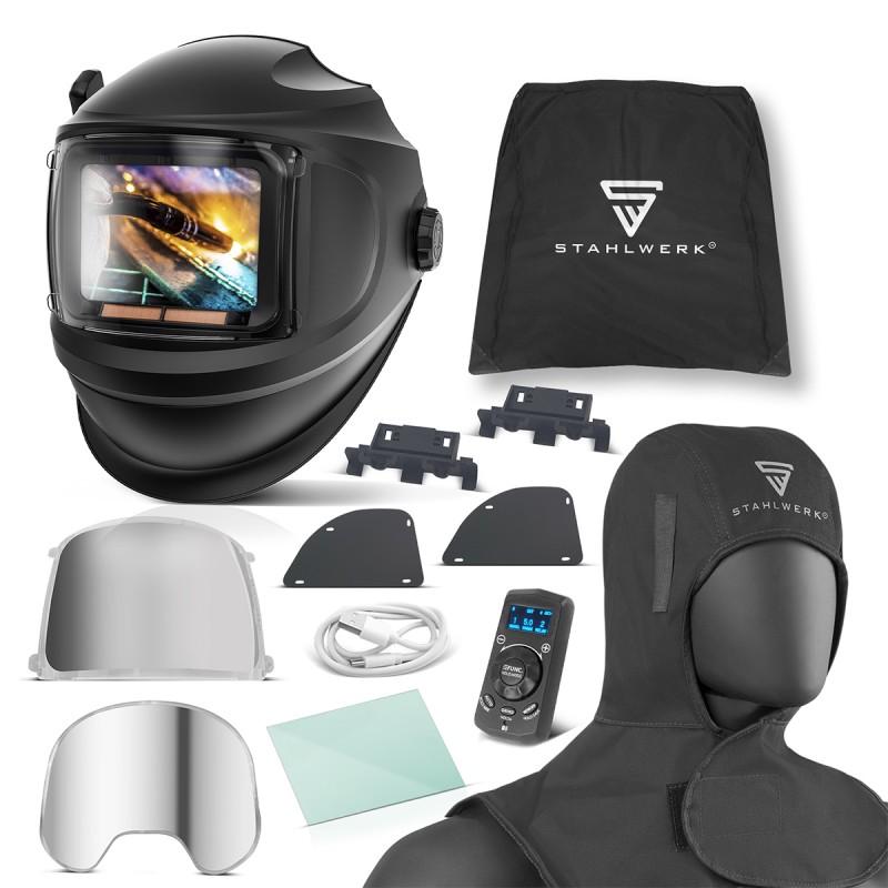 В дополнение к сварочному шлему с автоматическим затемнением, в комплект входит термостойкая сварочная маска, которая защищает от шлака, сварочных брызг, искр и пламени. Она огнестойкая, термостойкая и снижает теплопередачу. Прочный материал и усиленные швы обеспечивают долговечность и комфорт. Благодаря застежке-липучке маску можно индивидуально регулировать и носить под сварочным шлемом. Сварочная маска и защитный капюшон обеспечивают высокий уровень защиты во время сварки и резки. Это делает её ценным компонентом средств индивидуальной защиты (СИЗ) в промышленности, торговле и быту. Точная настройка достигается с помощью функции SHADE фильтрующего картриджа.