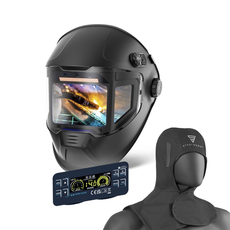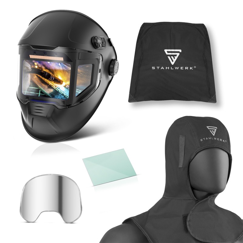 В дополнение к сварочному шлему с автоматическим затемнением, в комплект входит термостойкая сварочная маска, защищающая от шлака, сварочных брызг, искр и пламени. Она огнестойкая, термостойкая и снижает теплопередачу. Прочный материал и усиленные швы обеспечивают долговечность и комфорт. Благодаря застежке-липучке маску можно индивидуально регулировать и носить под сварочным шлемом. Комбинация сварочного шлема и защитной маски обеспечивает высокий уровень защиты во время сварки и резки. Это делает его ценным компонентом средств индивидуальной защиты (СИЗ) в промышленности, торговле и быту.