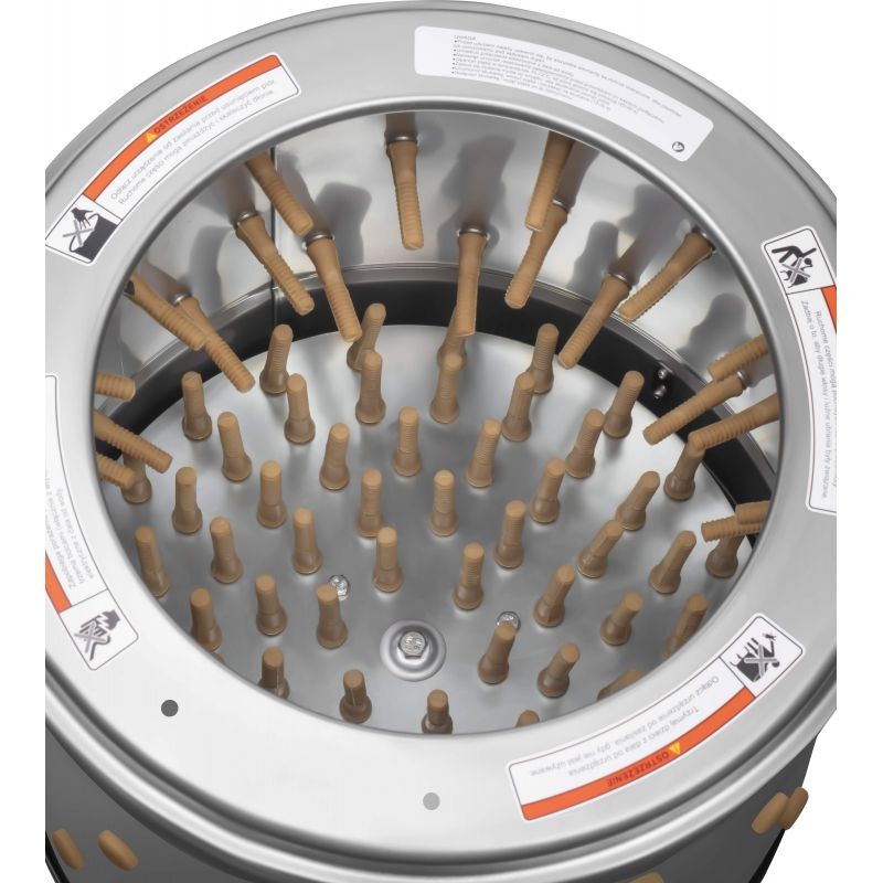 Модель KD4350 оснащена большим стальным рабочим резервуаром с многочисленными резиновыми пальцами (122 штуки), которые эффективно удаляют перья по мере вращения барабана. Внутренняя часть устройства изготовлена из нержавеющей стали, что обеспечивает коррозионную стойкость и легкость очистки. Планетарный редуктор обеспечивает стабильную и эффективную работу.