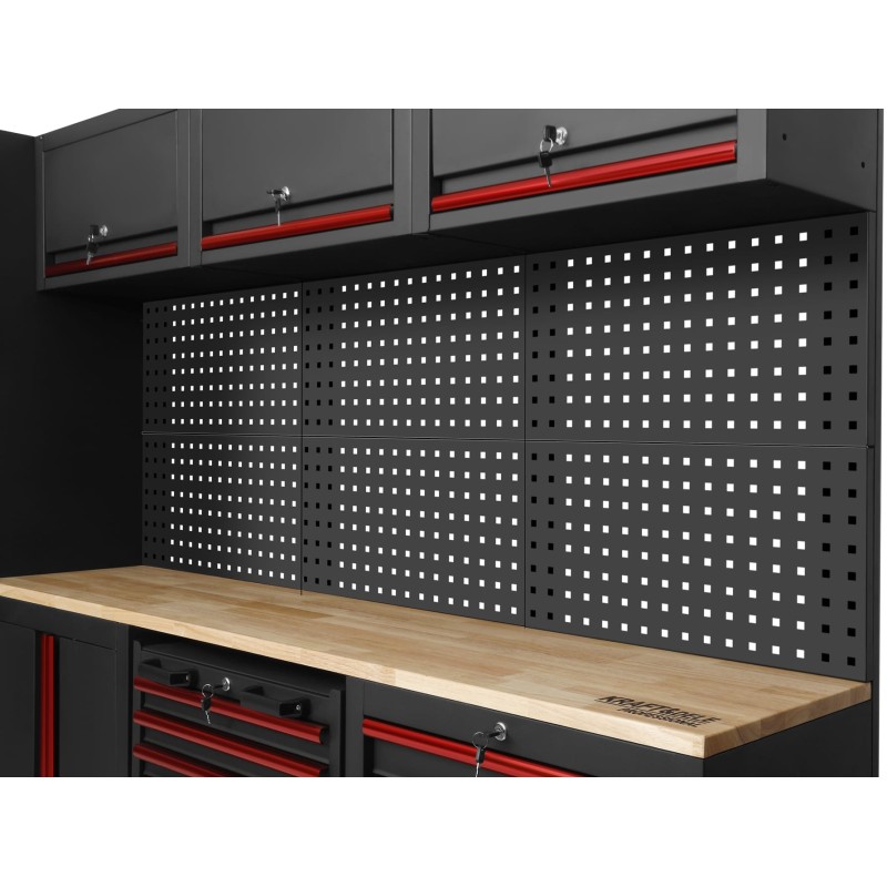 ✅ Полный комплект: шкаф с полками, шкаф с ящиками, нижний шкаф с полкой, шкаф с ящиками на колесиках, перфорированная панель, столешница