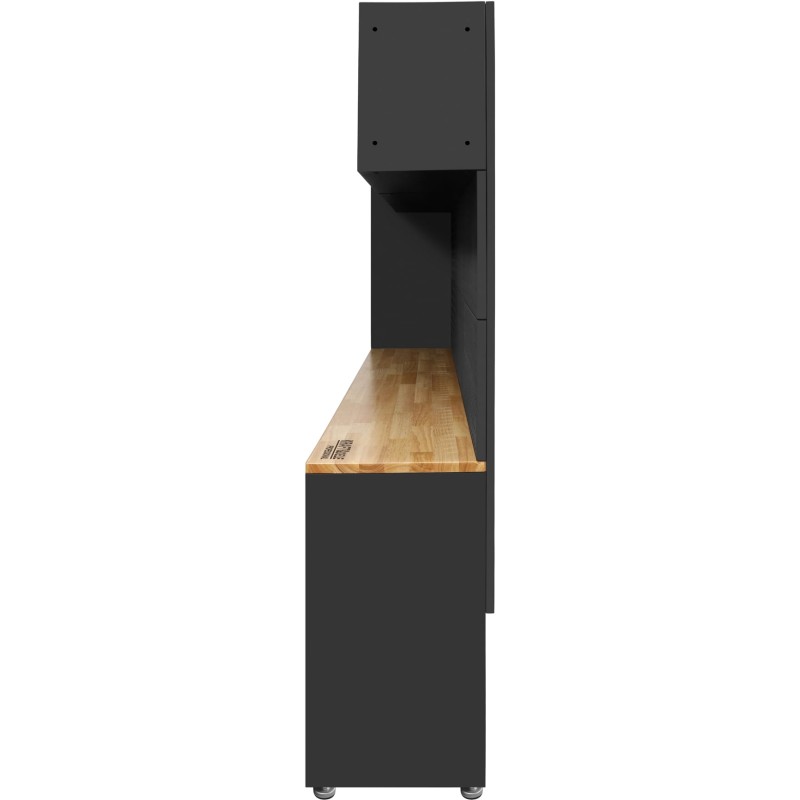 Прочная конструкция из толстой стали толщиной 1 мм и устойчивое к царапинам и повреждениям порошковое покрытие гарантируют долговечность. Столешница из каучукового дерева, выдерживающая нагрузку до 700 кг, обеспечивает стабильную и надежную рабочую поверхность даже при выполнении тяжелых работ в мастерской.